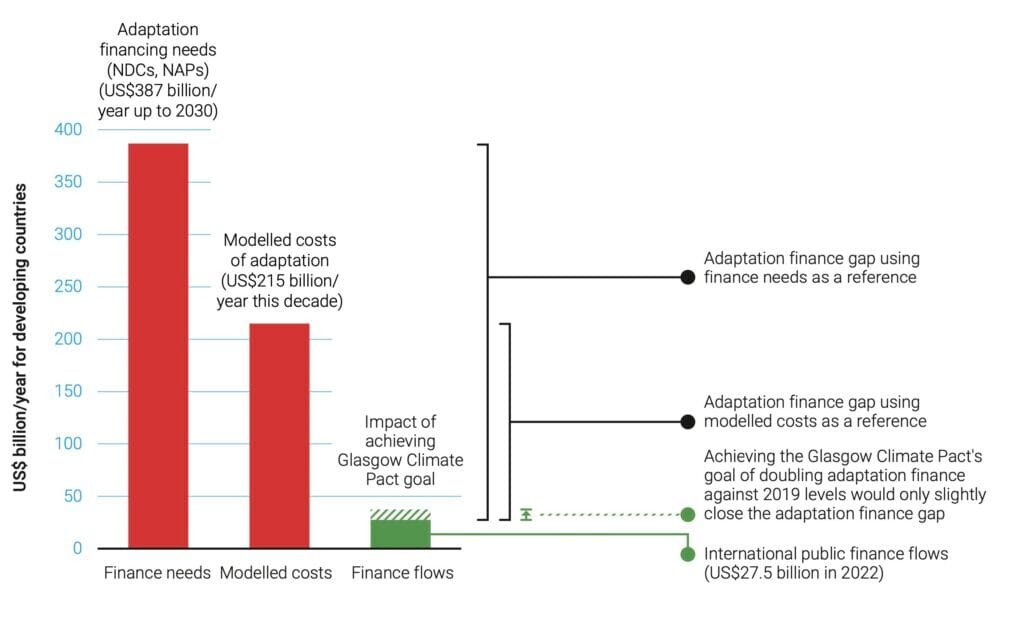The adaptation finance gap is significant: $215–387 billion/year is needed vs. only $28 billion delivered in 2022; even doubling by 2025 barely makes a dent.