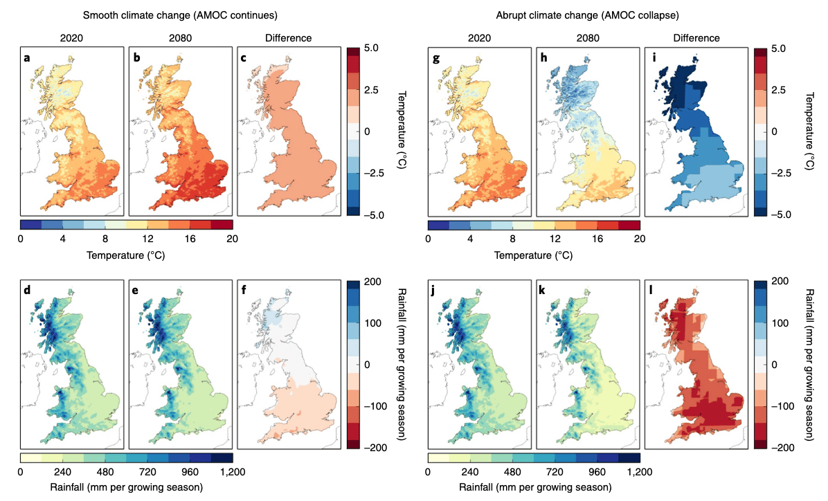An AMOC collapse would deliver a wholesale restructuring of the global food system. 58% of the land currently suitable for wheat and 59% for maize would become unusable. Together with rice, these crops supply more than half of global calories. Their collapse would shred food security.