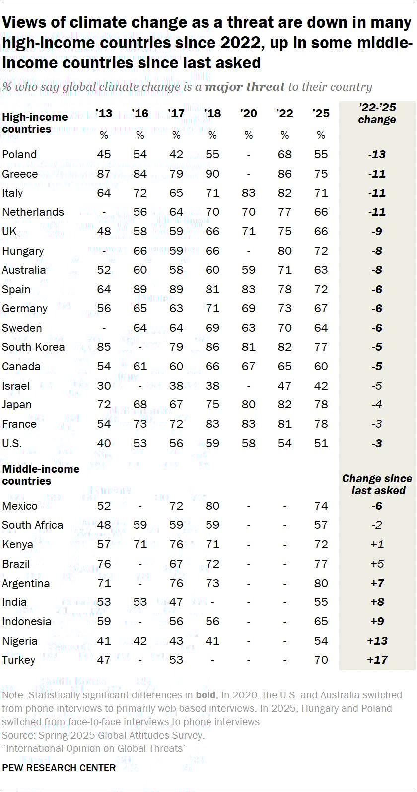 A Pew global survey finds 67% of adults now label climate change a major threat to their countries, but attitudes are splintering, especially in rich nations. Since 2022, concern has waned in affluent states like the Netherlands and Italy, with ideological splits widening dramatically. In the U.S., liberals are over four times more likely than conservatives to recognise the danger (84% vs 20%). Right-wing populist supporters across Europe similarly dismiss climate risks. The survey also finds that younger adults overwhelmingly view climate as an existential challenge, though in some countries - Sweden, Japan, South Korea and Argentina - older populations are comparatively more alarmed. These findings suggest climate fatigue and polarisation are undermining consensus just as adaptation demands cross-party urgency. The window for brave, ambitious policy, backed by demonstrated public support, may be narrowing.