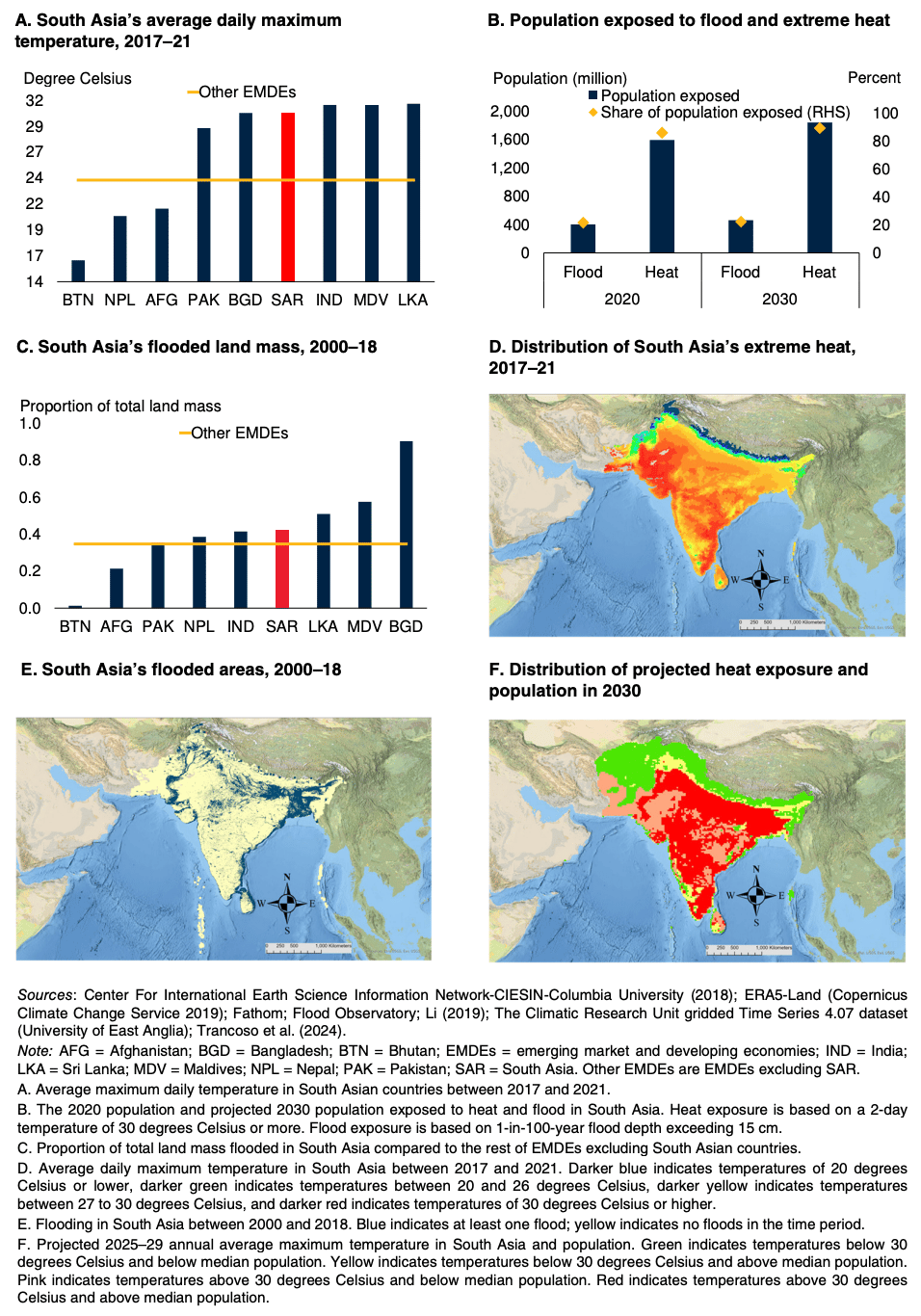 A World Bank survey of 250 coastal villages revealed that 57% of Bangladesh's coastal households identify inadequate embankments, cyclone-resistant structures, and protective infrastructure as the primary barrier to building resilience, while 56% cite financial constraints as limiting adaptation implementation. By 2030, nearly 90% of South Asia's population will face extreme heat risk and roughly 25% severe flooding, with coastal salinity intensifying land loss and crop failure. Although 80% of households have undertaken low-cost adaptation interventions—basic solutions which reflect a lack of access to credit, advanced technologies, or climate-resilient public infrastructure—satellite data reveal that coastal residents experienced an average of 19 floods annually during 2000–2018. Bangladesh needs $12 billion yearly for adaptation and mitigation, but can provide only $3.5 billion domestically, leaving a critical gap requiring innovative financing and private-sector participation.